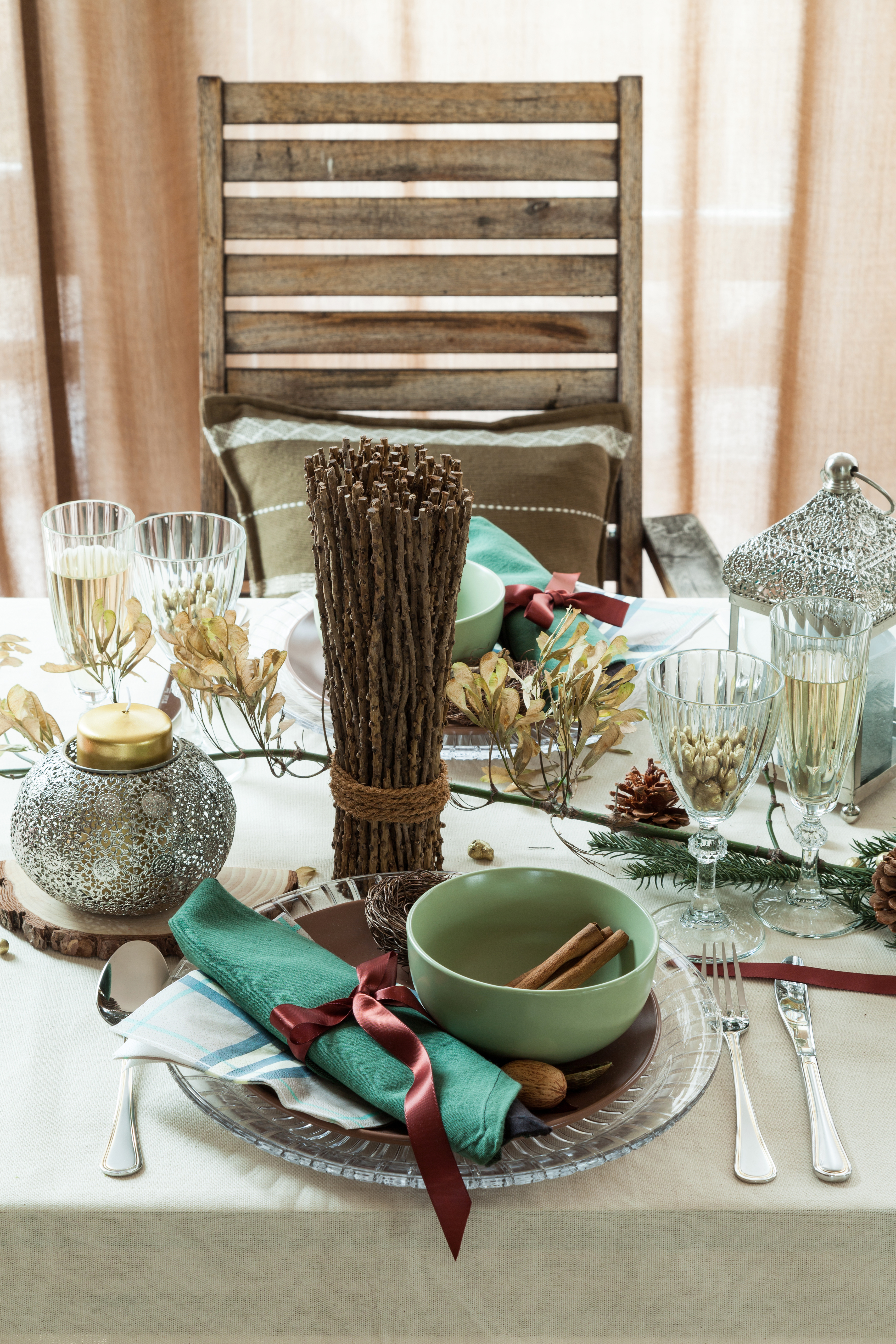 Bardziej wytworną wersją tej aranżacji będzie dodanie złotych talerzy i naturalnych ozdób.