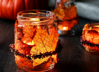 Piękne dekoracje stworzymy, jeśli do dużych świec w kształcie walca przywiążemy sznurkiem jutowym, zebrane w parku kolorowe liście. Możemy je przywiązać do prześwitujących szklanych naczyń, tak aby szczelnie wypełniły zewnętrzne ścianki, a w nich postawić świece, płomień prześwietlający liście da niesamowity efekt.