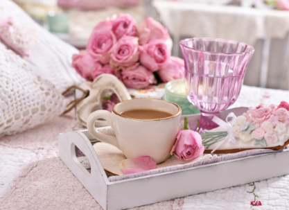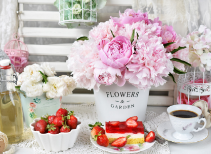 Słodki deser w stylu shabby chic na pastelowym stole będzie nie tylko ozdobą, ale pysznym dodatkiem do kawy.