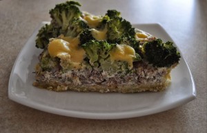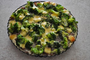 Następnie na gotowym cieście ułożyć mięso, brokuły a na końcu posypać serem. Tartę włożyć jeszcze na 10 minut do piekarnika, żeby ser się roztopił.