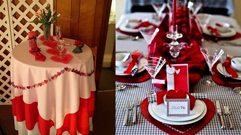 Pierwszą czynnością jest wybór odpowiedniego obrusa. Najlepsze będzie białe nakrycie, które wyeksponuje czerwone dodatki. Obrus można udekorować samodzielnie. Wystarczą papierowe serwetki wycięte w kształcie serc lub materiałowe oryginalnie złożone. Aby nadać elegancji serwetki można włożyć w pierścienie.