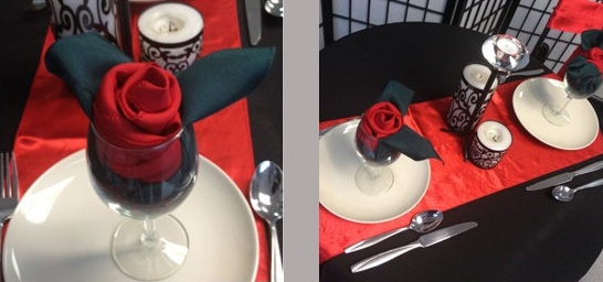 Kieliszki można wykorzystać do stworzenia ozdoby na stół – róży. Wystarczy odrobina czerwonego i ciemnego (bądź zielonego) materiału. Taki drobiazg jest niezwykle oryginalny i zwraca na siebie uwagę