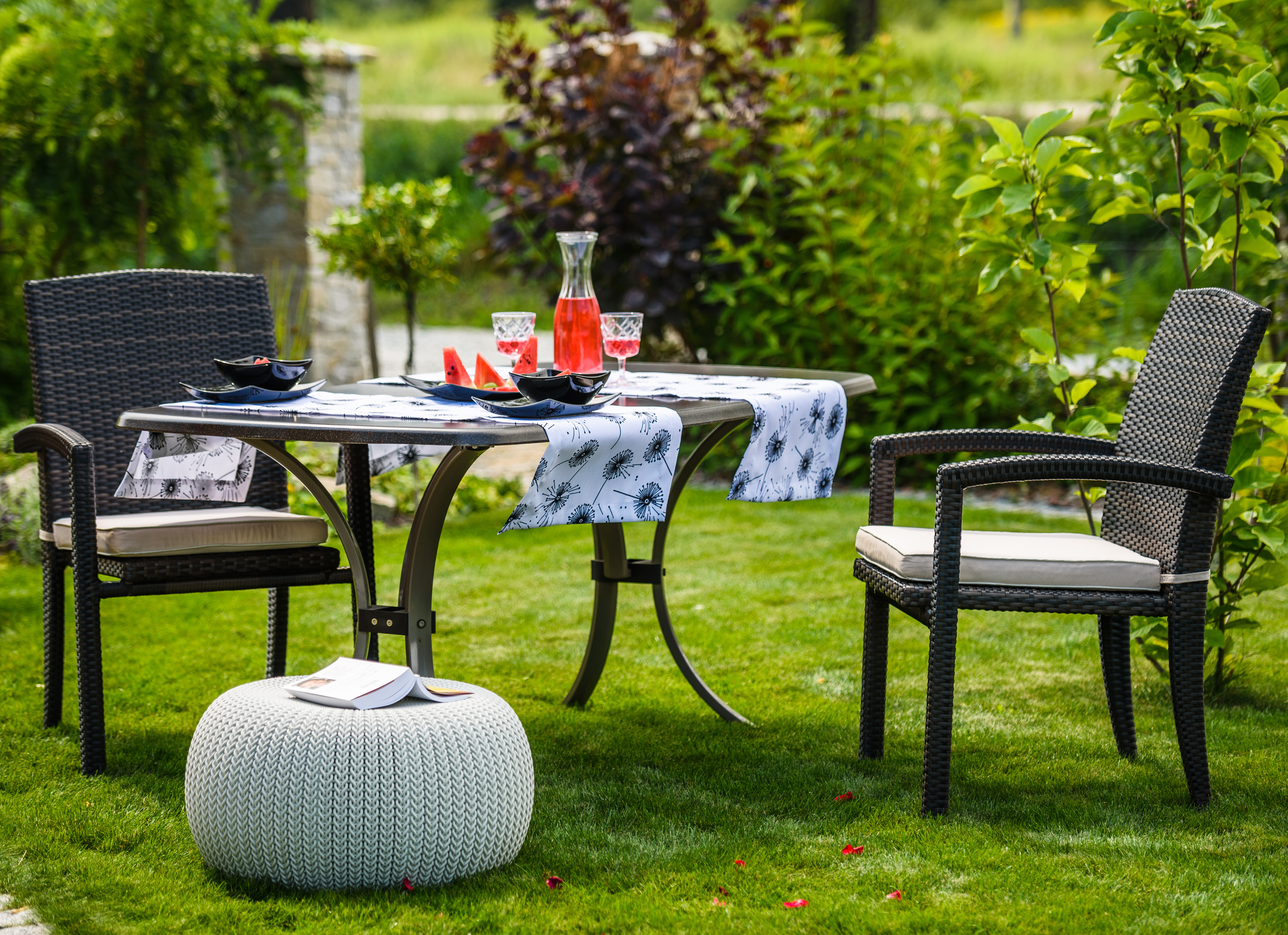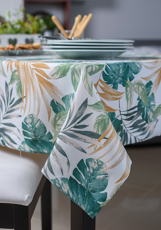 Styl Tropikalny na Tarasie: Wybierz obrus w żywe, tropikalne wzory – liście palm, monstery lub papugi. Dodaj poduszki z motywami egzotycznych roślin, bambusowe podkładki i świeże koktajle w kolorowych szklankach. Dzięki takim akcentom Twoje letnie spotkania nabiorą wyjątkowego charakteru.