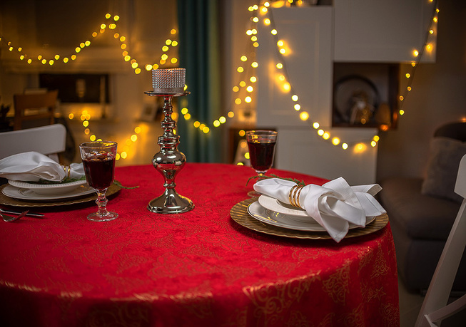 Plamoodporność: Obrus został wykonany z wysokiej jakości tkaniny plamoodpornej, co znacznie ułatwia utrzymanie go w czystości nawet podczas obfitych, świątecznych posiłków. Dzięki specjalnej apreturze rozlane płyny nie wnikają w głąb materiału, lecz tworzą krople na powierzchni, które można łatwo usunąć ściereczką.