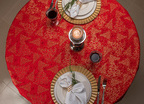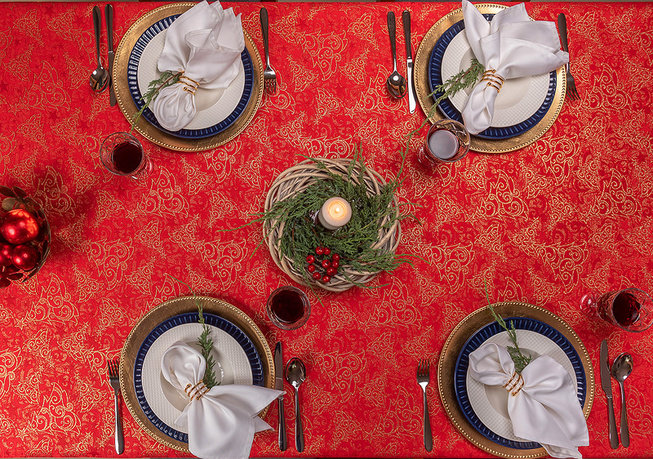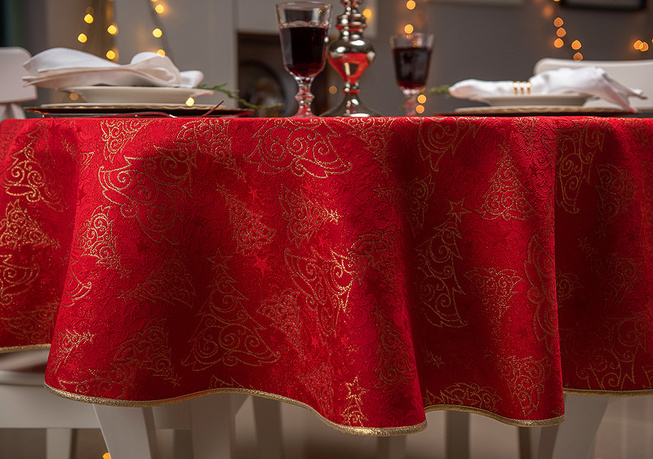 Obrus plamoodporny Christmas Tree RED to elegancka i pełna magii propozycja na świąteczny stół. Na czerwonym tle tkaniny ukazuje się bogaty, żakardowy wzór, w którym złote choinki, gwiazdy i spiralne ornamenty mienią się niczym świąteczne światełka. Dzięki trójwymiarowej strukturze tkaniny i zróżnicowanemu nasyceniu złotej barwy, obrus prezentuje niezwykłą głębię i zmienia swój charakter w zależności od kąta padania światła. To dekoracja, która zamienia każdy stół w centrum świątecznych opowieści – pełnych ciepła, elegancji i odrobiny tajemnicy.