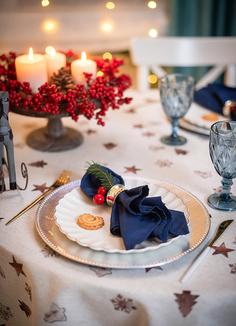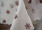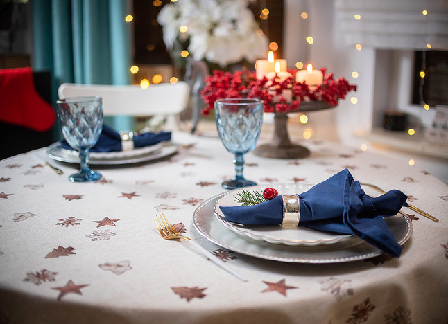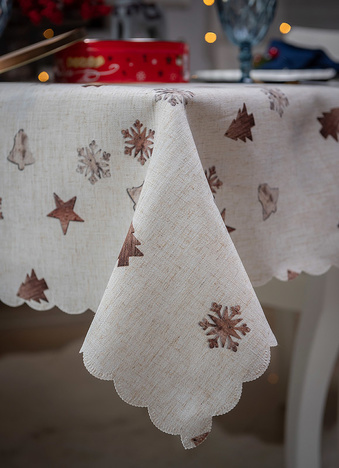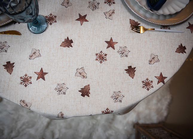 Obrus Christmas Harmony to połączenie naturalnej prostoty i świątecznego klimatu. Delikatna, matowa tkanina z domieszką lnu przyciąga wzrok subtelną fakturą i sprawia, że całość ma wyjątkowo przytulny, naturalistyczny charakter. Zdobienia w odcieniach ciepłego brązu – gwiazdki, choinki, płatki śniegu i dzwoneczki – tworzą wzór, który idealnie wpisuje się w bożonarodzeniową aranżację w stylu slow lub boho.