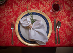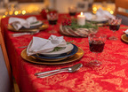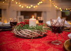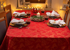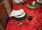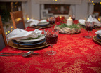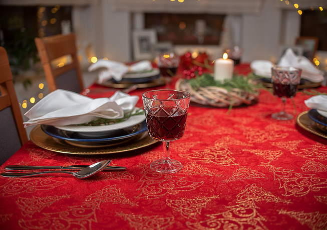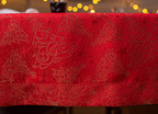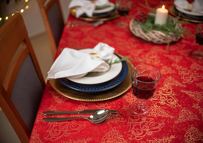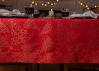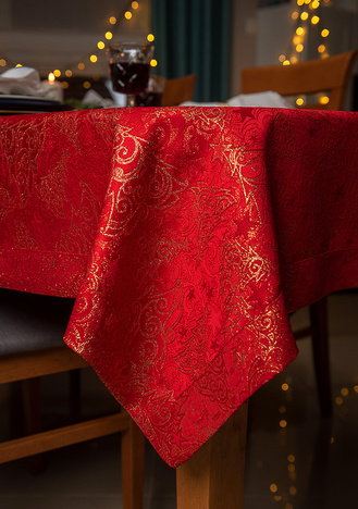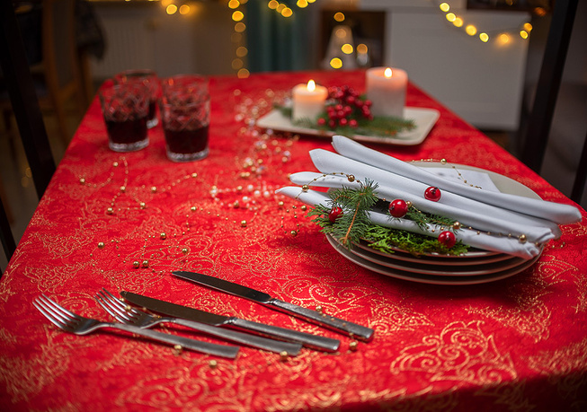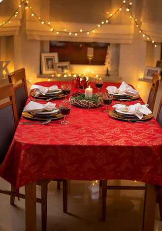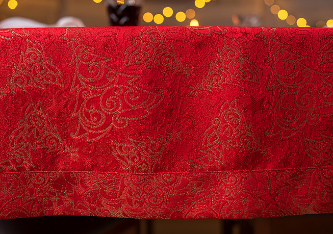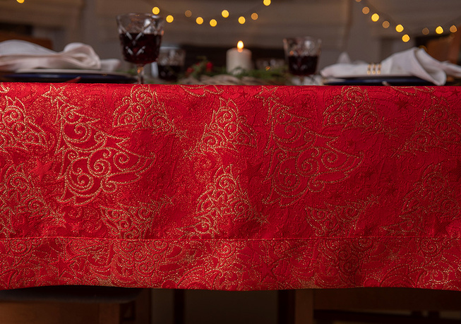 Obrus plamoodporny Christmas Tree RED to elegancka i pełna magii propozycja na świąteczny stół. Na czerwonym tle tkaniny ukazuje się bogaty, żakardowy wzór, w którym złote choinki, gwiazdy i spiralne ornamenty mienią się niczym świąteczne światełka. Dzięki trójwymiarowej strukturze tkaniny i zróżnicowanemu nasyceniu złotej barwy, obrus prezentuje niezwykłą głębię i zmienia swój charakter w zależności od kąta padania światła. To dekoracja, która zamienia każdy stół w centrum świątecznych opowieści – pełnych ciepła, elegancji i odrobiny tajemnicy.