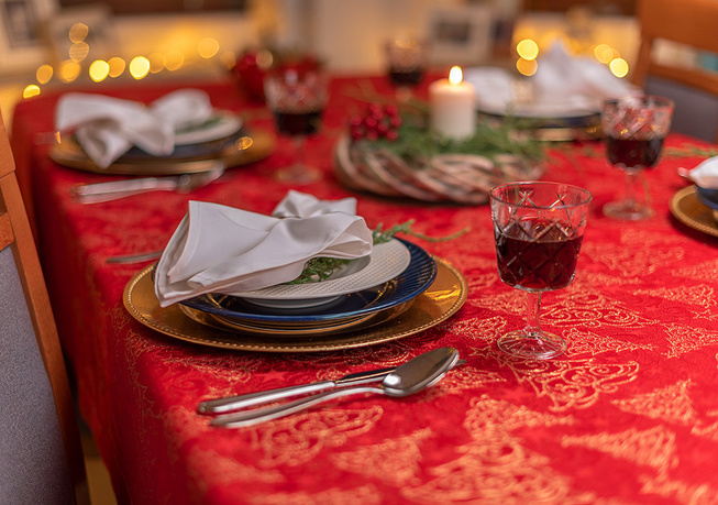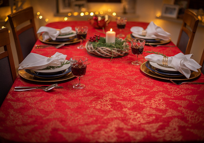 Plamoodporność: Obrus został wykonany z wysokiej jakości tkaniny plamoodpornej, co znacznie ułatwia utrzymanie go w czystości nawet podczas obfitych, świątecznych posiłków. Dzięki specjalnej apreturze rozlane płyny nie wnikają w głąb materiału, lecz tworzą krople na powierzchni, które można łatwo usunąć ściereczką.
