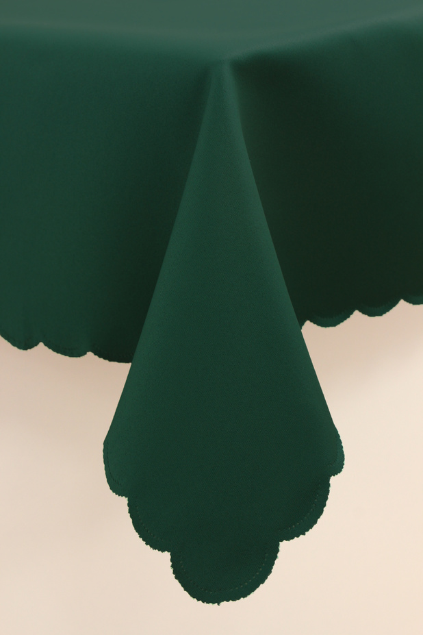 Bardzo praktyczny obrus plamoodporny w zielonym kolorze, zakończony delikatną "falą", zaskoczy swoją prostotą i elegancją. Dedykowany jest osobom lubiącym tradycyjny wystrój, minimalizm i ceniącym praktyczny charakter dekoracji stołowych.
