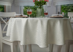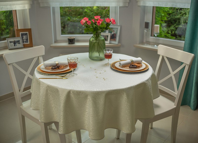 • Eleganckie wykończenie: Obrus zakończony jest ozdobnym wykończeniem w postaci kremowej satynowej lamówki.