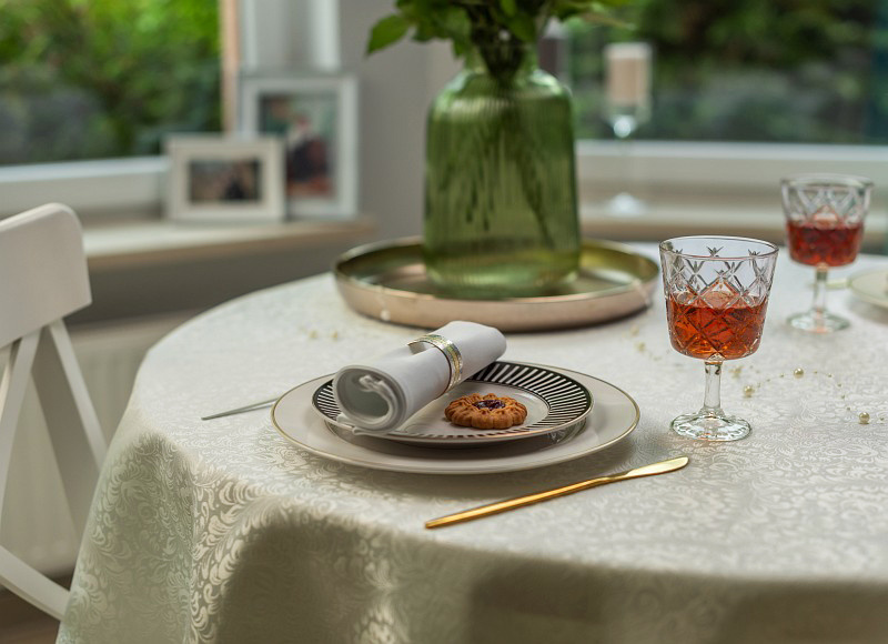 • Plamoodporna tkanina – Obrus został wykonany z wysokiej jakości tkaniny plamoodpornej, co ułatwia utrzymanie go w czystości nawet podczas obfitych posiłków. Dzięki plamoodpornej apreturze rozlane płyny nie wnikają w głąb tkaniny, tylko tworzą na powierzchni obrusu krople, które łatwo można zebrać, np. za pomocą czystej ściereczki. Plamoodporna powłoka sprawi, iż łatwiej będzie nam utrzymać obrus w czystości i dłużej będziemy się cieszyć pięknym wyglądem obrusu.