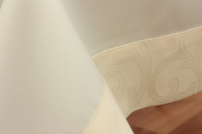 Atutem tkaniny obrusowej Gładki II jest możliwość wykonania obrusów w dużych rozmiarach, np. 200x200,200x350, 250x250, itp.