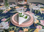 Główne motywy rozkwitniętych pąków magnolii mają wymiar około 24cm, a ich kolory to lilaróż, beż i brzoskwiniowy. Pomiędzy nimi widoczne są gałązki i listki utrzymane w oliwkowych i butelkowych tonacjach z domieszką brązu. Wzór występuje na całej tkaninie, tworząc doskonałą kompozycję z granatowo-miętowym tłem. Obrus ma wykończenie w postaci listwy dekoracyjnej o szerokości 10 centymetrów.