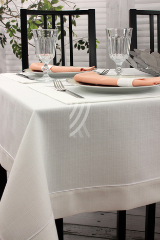 Ekskluzywny obrus LEN z najnowszej Kolekcji Len w kolorze białym, wykończony szeroką ramką, zdobiony wypustką w kolorze białym.