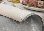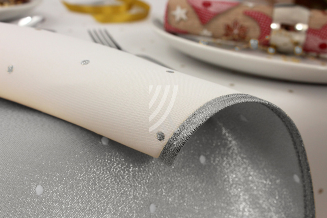 Dwustronny charakter obrusu, gwarantuje że na każdej stronie tkanina prezentuje się niezwykle efektownie w zależności od potrzeb i charakteru uroczystości. Prawa strona prezentuje srebrny, brokatowy wzór na białym tle, a lewa strona pokazuje ten sam motyw w kolorze białym na brokatowym, srebrnym tle. Obrus jest ozdobiony piękną lamówką, wszytą z największą starannością dla osiągnięcia najlepszego wrażenia na stole.
