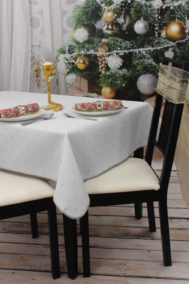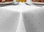 Bardzo elegancki obrus świąteczny, wzór KROPKA SREBRNA, wykończony lamówką brokatową.