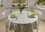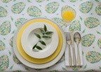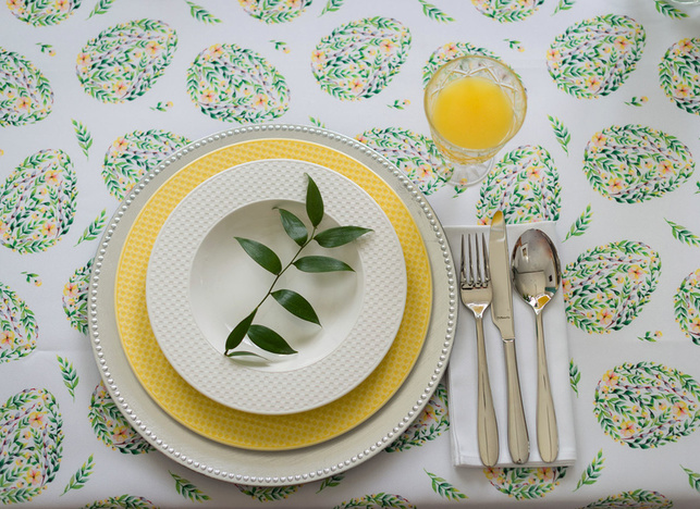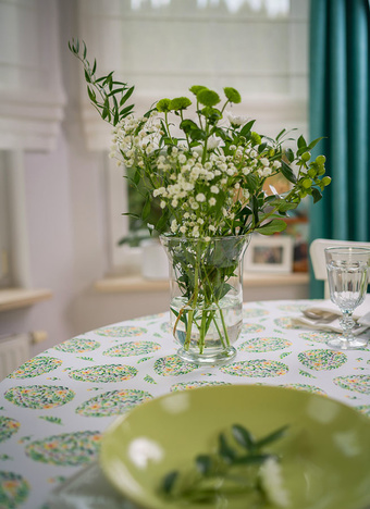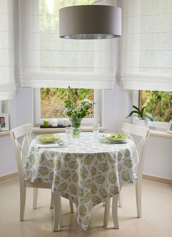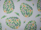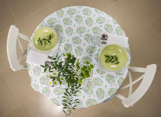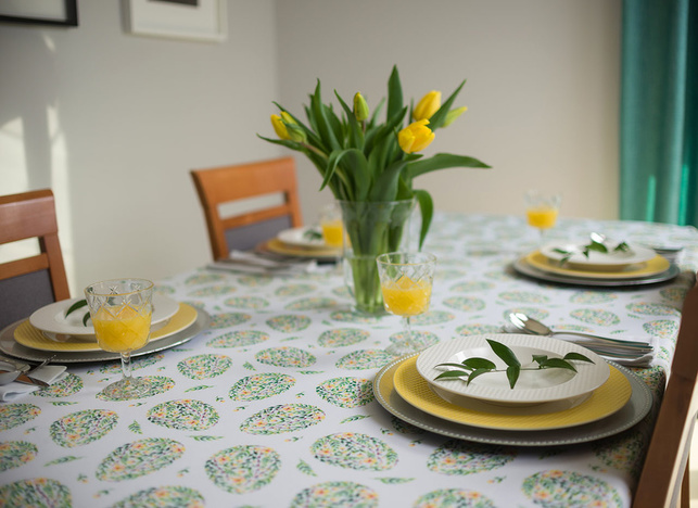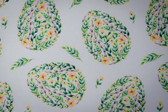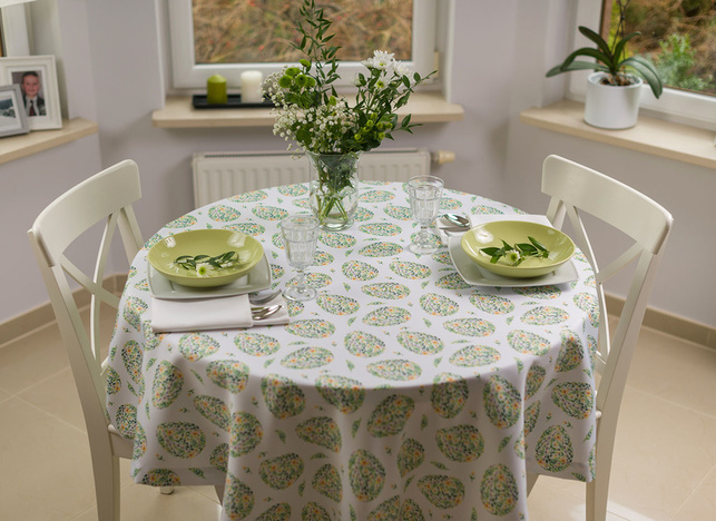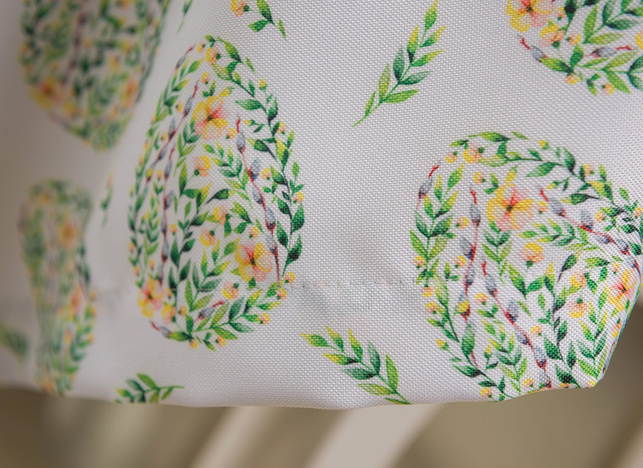 Obrus plamoodporny wielkanocny z przepięknym motywem jajek złożonych z wijących się zielonych drobnych listków, bazi oraz żółtych kwiatków. Jaja rozmieszczone są w kilkucentymetrowych odstępach, mają wysokość około 10 cm.