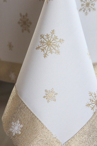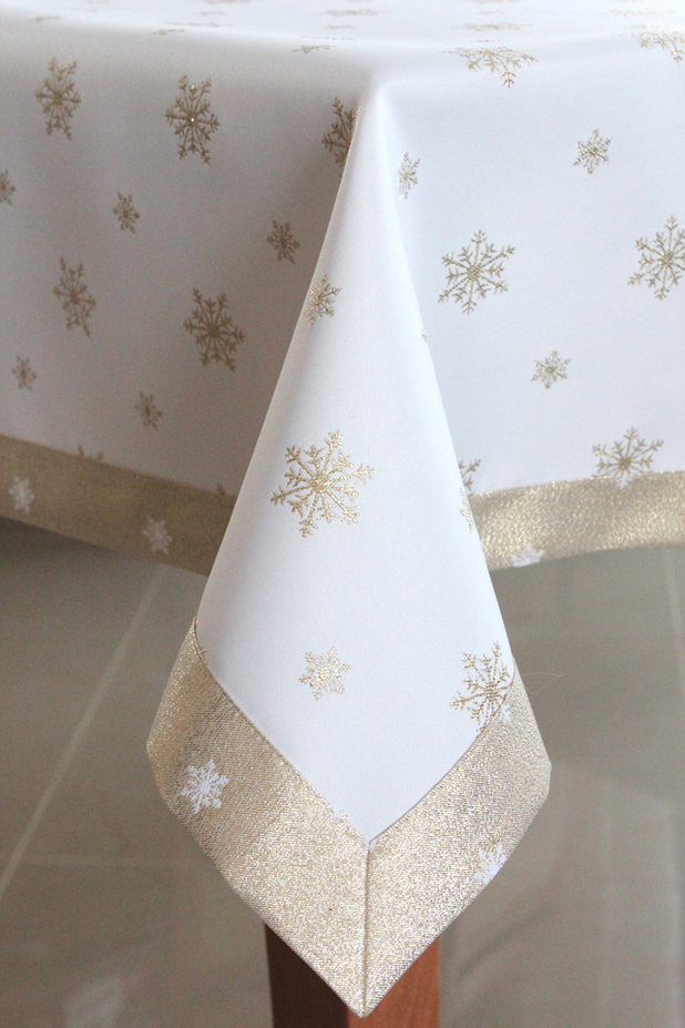 Bardzo elegancki, brokatowy obrus świąteczny, ze wzorem Śnieżynka Złota przywoła klimat śnieżnej zimy i doda uroku stołom w domu i w restauracji.