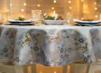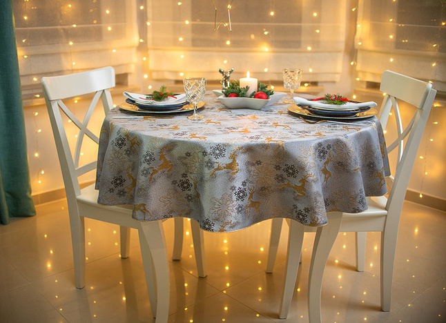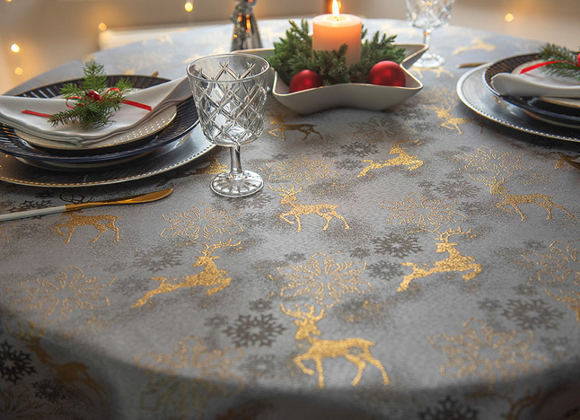 Wyjątkowo elegancki plamoodporny obrus z Kolekcji Frozen Christmas spodoba się każdemu ceniącemu ekskluzywny charakter świątecznego obrusu. Bazą tkaniny obrusowej jest szare tło, na którym to niezwykle okazale prezentują się główne motywy złoto-brokatowych jelonków, a także ażurowe śnieżynki zarówno w złotym, jak i w szarym wydaniu. Idealny wybór dla tych, którzy lubią to ciekawe połączenie złota i szarości, zwłaszcza, że tkaninę tę charakteryzuje ciekawy wygląd i zmrożony blask, który polubią wszyscy ceniący wytworność w nowoczesnym wydaniu.