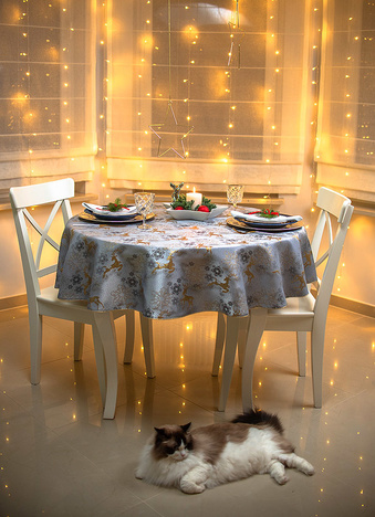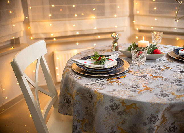 Obrus lśni zawsze inaczej, w zależności jak pada nań światło. Wygląda bardzo korzystnie, bo ma wiele odsłon i możliwości aranżacji. Będzie wspaniałą propozycją dla osób, które podchodzą praktycznie i artystycznie do stylizacji stołu podczas Świąt Bożego Narodzenia.