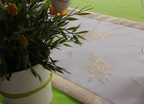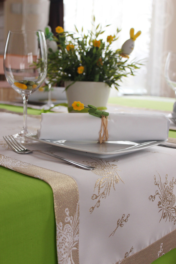 Oryginalna, a zarazem bardzo praktyczna nakładka plamoodporna z motywem wielkanocnym - złotymi baziami odmieni charakter tradycyjnego lub nowoczesnego wielkanocnego stołu.