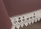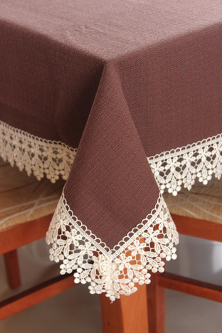 Ekskluzywny obrus LEN z najnowszej Kolekcji Len w kolorze c.brązowym, wykończony gipiurą w kolorze kremowym.