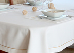 Szykowna i oryginalna podkładka z Kolekcji Len w kolorze pięknej zgaszonej bieli, wykończona szeroką ramką, zdobiona piękną wypustką w kolorze złotym zagra pierwszo - lub drugoplanową rolę w wielu codziennych i uroczystych aranżacjach w domu i w restauracji.