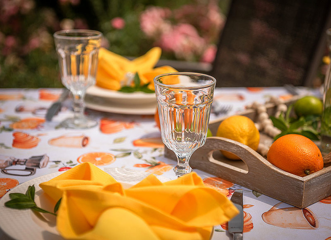 • Plamoodporność: Obrus został wykonany z wysokiej jakości tkaniny plamoodpornej, co ułatwia utrzymanie go w czystości nawet podczas obfitych posiłków. Dzięki plamoodpornej apreturze rozlane płyny nie wnikają w głąb tkaniny, tylko tworzą na powierzchni obrusu krople, które łatwo można zebrać, np. za pomocą czystej ściereczki. Plamoodporna powłoka sprawi, iż łatwiej będzie nam utrzymać obrus w czystości i dłużej będziemy się cieszyć pięknym wyglądem obrusu.