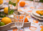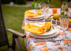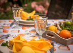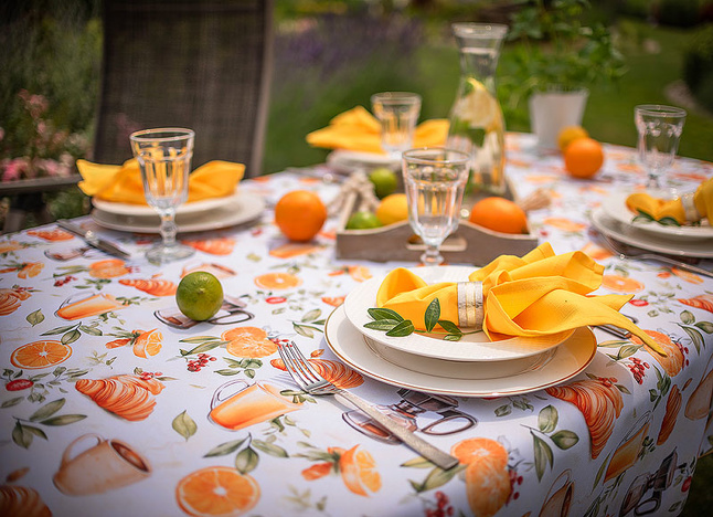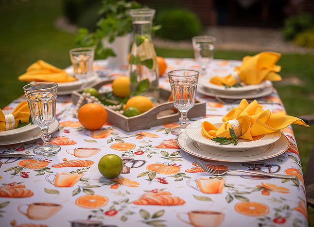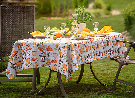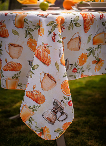 Obrus Bonjour to kulinarna opowieść o leniwym, słonecznym poranku – pachnącym kawą, świeżymi rogalikami i sokiem pomarańczowym. Wzór przedstawia realistyczne ilustracje filiżanek z kawą, croissantów, cząstek pomarańczy i liści cytrusów, które układają się w apetyczną kompozycję pełną ciepła i energii. Całość została utrzymana w subtelnej palecie kolorystycznej – zdominowanej przez odcienie złamanej bieli, ciepłych beżów, pomarańczy i brązów – tworząc idealną oprawę dla codziennych posiłków.