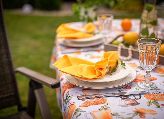 • Estetyczne wykończenie: Obrus zakończony jest ozdobnym wykończeniem w postaci żółtej wypustki, która idealnie komponuje się z kolorystyką tkaniny,