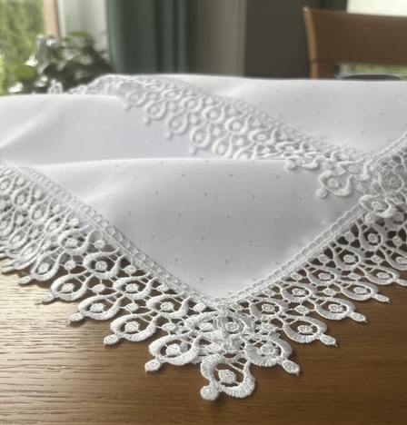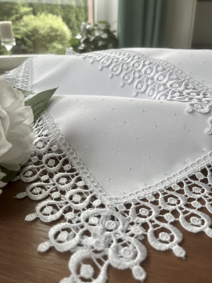 Obrus plamoodporny Brick z Gipiurą jest bardzo elegancki i niespotykany. Niezwykle efektowne połączenie wzorzystej gipiury i białej, plamoodpornej tkaniny powoduje, że obrus wspaniale prezentuje się na stole.