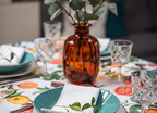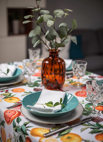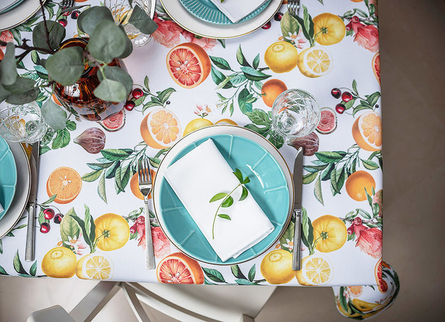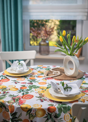 Obrus Citrus Fiesta to prawdziwa uczta dla zmysłów – pełna soczystych pomarańczy, cytryn, grejpfrutów, fig i granatów otoczonych bujną zielenią liści i delikatnymi kwiatami cytrusowymi. Jego wzór przenosi nas do ciepłych, śródziemnomorskich ogrodów, gdzie dojrzewające owoce pachną słońcem i radością lata.