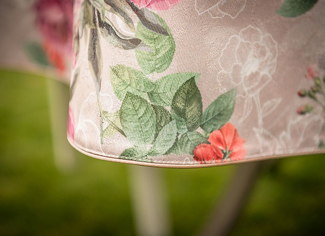 • Tkanina żakardowa o marmurkowej fakturze – Gruby, dekoracyjny materiał z subtelnym połyskiem i delikatnym, marmurkowym deseniem. Struktura tkaniny w połączeniu z nadrukiem kwiatów tworzy efekt trójwymiarowego wzoru – eleganckiego i bardzo dekoracyjnego.
