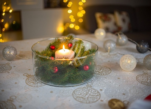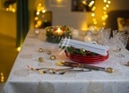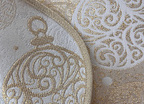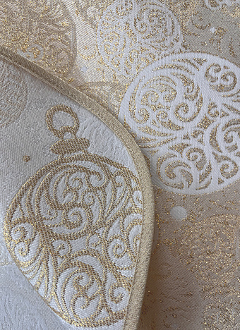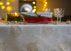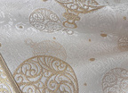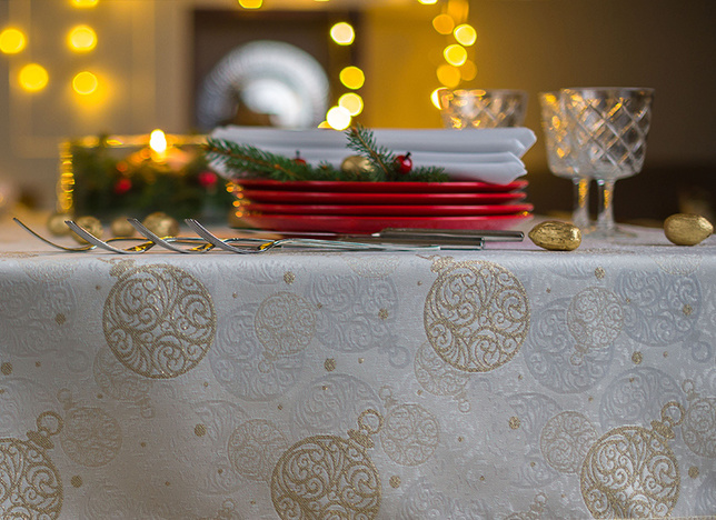 Obrus Frozen Bombki w złotym kolorze. Prezentuje się bardzo dobrze w wielu wnętrzach o nowoczesnym i klasycznym charakterze. Ożywia i dodaje im bardzo wytwornego charakteru. Będzie piękną ozdobą stołu w salonie, w jadalni lub w restauracji.