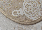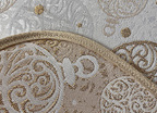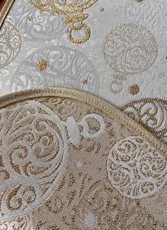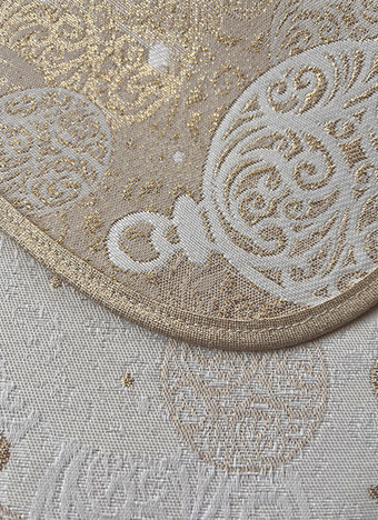 Obrus ma delikatnie plecioną fakturę i może być dwustronny. Z prawej strony wytwornie prezentuje się złoty wzór na kremowym tle, a z lewej strony kremowy na złotym tle.