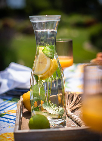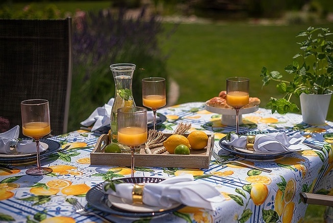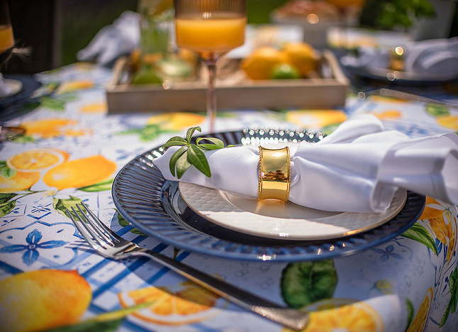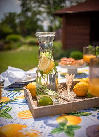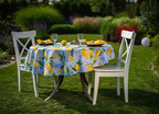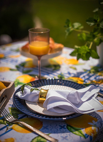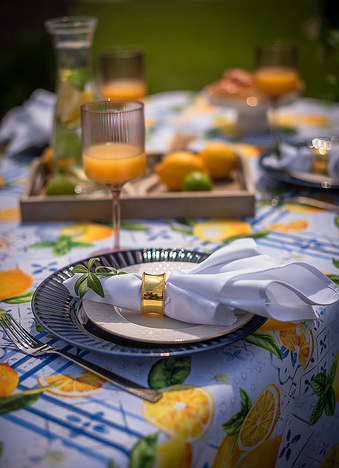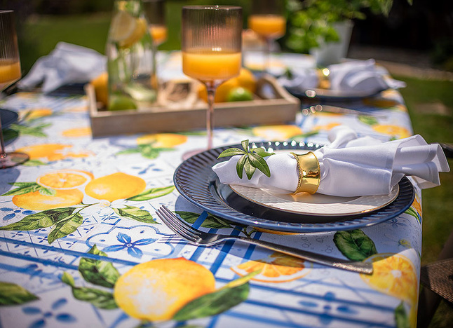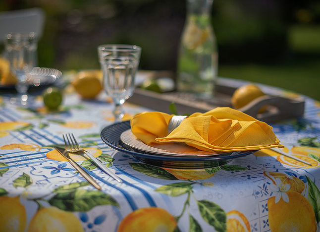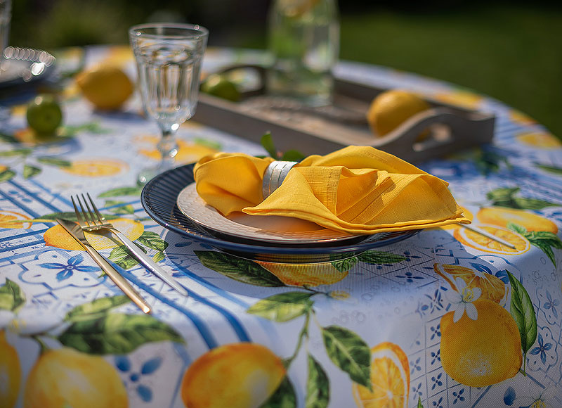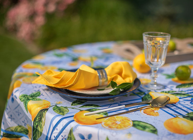 Obrus Lemon Garden to zaproszenie do letniego ogrodu pełnego aromatycznych cytryn i orzeźwiającej zieleni. Inspirowany śródziemnomorskimi klimatami, zachwyca printem w soczyste owoce i subtelne kaflowe wzory w odcieniach błękitu. Ten dynamiczny, a zarazem harmonijny motyw wprowadza energię, świeżość i pogodny nastrój do każdej aranżacji stołu – zarówno na tarasie, jak i w jadalni.