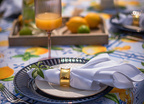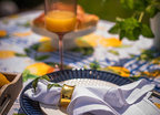 Jasne tło oraz cytrusowe akcenty dodają lekkości, jednocześnie podkreślając wyjątkową intensywność kolorów. Wzór jest pełen detali – liści, plasterków cytryn i ceramicznych ornamentów – co czyni go doskonałą dekoracją stołu na lato. Doskonale sprawdzi się podczas rodzinnych śniadań w ogrodzie, wakacyjnych kolacji czy codziennych posiłków w domowym zaciszu.