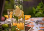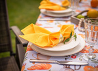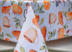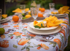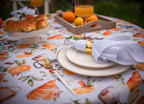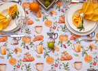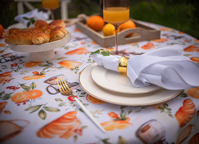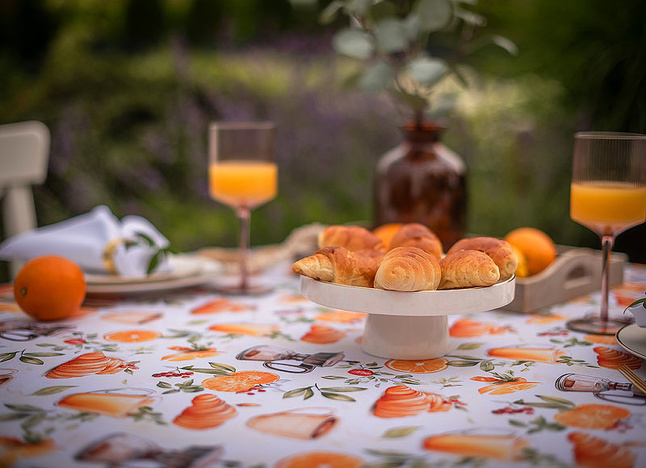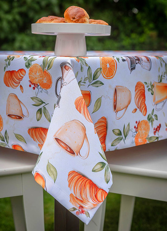 Obrus Bonjour to kulinarna opowieść o leniwym, słonecznym poranku – pachnącym kawą, świeżymi rogalikami i sokiem pomarańczowym. Wzór przedstawia realistyczne ilustracje filiżanek z kawą, croissantów, cząstek pomarańczy i liści cytrusów, które układają się w apetyczną kompozycję pełną ciepła i energii. Całość została utrzymana w subtelnej palecie kolorystycznej – zdominowanej przez odcienie złamanej bieli, ciepłych beżów, pomarańczy i brązów – tworząc idealną oprawę dla codziennych posiłków.