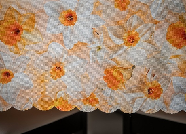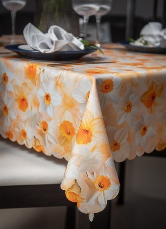 • Uniwersalność – Kwiatowy motyw narcyzów sprawia, że obrus doskonale sprawdzi się zarówno podczas wiosennych i wielkanocnych aranżacji stołu, jak i jako codzienna dekoracja kuchni czy jadalni. Pięknie komponuje się z naturalnymi dodatkami, jasną ceramiką i świeżymi kwiatami.