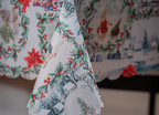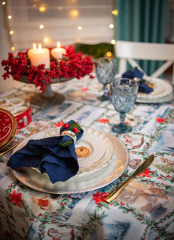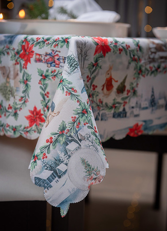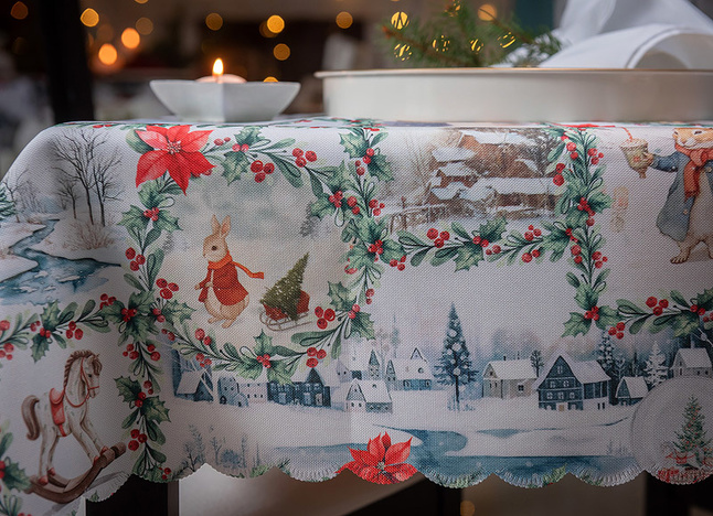 Ten obrus to prawdziwa podróż do świata świątecznych opowieści – niczym kadr wyjęty z zimowej bajki. Na tkaninie spotkasz leśne zwierzęta szykujące się do świąt, urocze króliczki w szalikach niosące choinki oraz malownicze, zasypane śniegiem miasteczka. Wszystko otoczone jest girlandami ostrokrzewu i gwiazdami betlejemskimi, które wprowadzają aurę radości i rodzinnego ciepła.