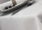 Dwustronny charakter obrusu, gwarantuje że na każdej stronie tkanina prezentuje się niezwykle efektownie w zależności od potrzeb i charakteru uroczystości. Prawa strona prezentuje srebrny, brokatowy wzór na białym tle, a lewa strona pokazuje ten sam motyw w kolorze białym na brokatowym, srebrnym tle.
