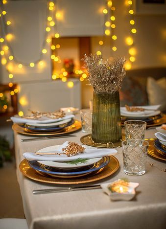 Obrus zakończony jest ozdobnym wykończeniem w postaci złotej brokatowej wypustki.