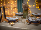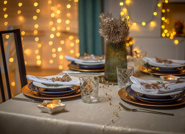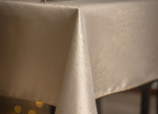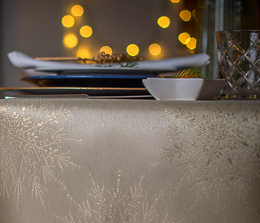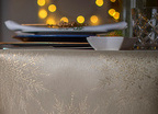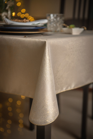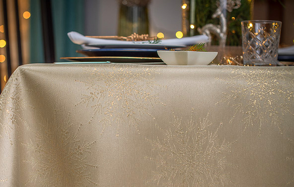 Obrus z Kolekcji Polar Star beżowo-złoty jest niezwykle strojny i wytworny. Obrus ma ciekawy wzór składający się ze śnieżynek o średnicy około 18 centymetrów, rozrzuconych po całości obrusu. Ten motyw sprawdzi się doskonale w niejednej świątecznej stylizacji stołu. Obrus sprawi, że stół będzie wyglądał odświętnie w domowych, restauracyjnych i hotelowych aranżacjach.