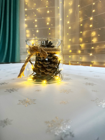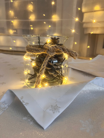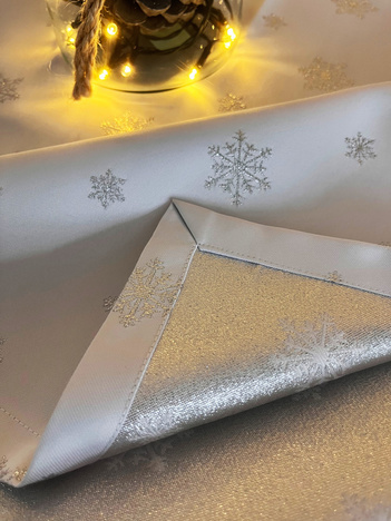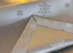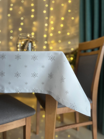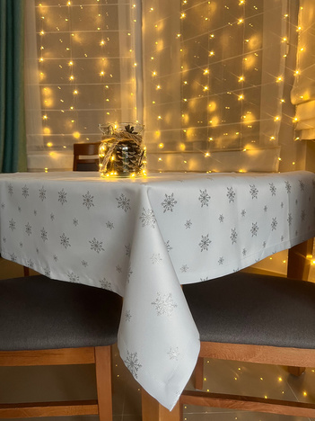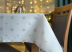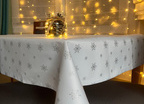 Bardzo elegancki, brokatowy obrus świąteczny, ze wzorem Śnieżynka Srebro przywoła klimat śnieżnej zimy i doda uroku stołom w domu i w restauracji.