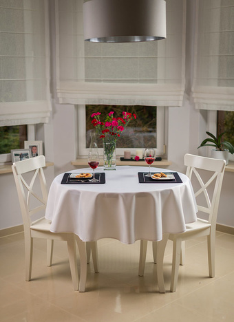 Obrus plamoodporny Vivien w białym kolorze, zakończony białą wypustką, jest dedykowany osobom lubiącym tradycyjny wystrój, minimalizm i ceniącym praktyczny charakter dekoracji stołowych. Obrus doskonale sprawdzi się jako wykończenie każdego stołu w jadalni, w kuchni, w salonie, jak i w restauracji.