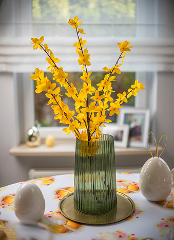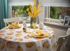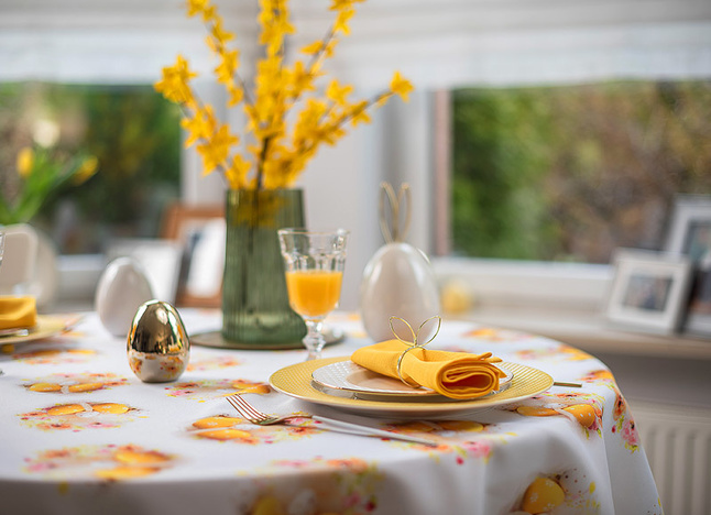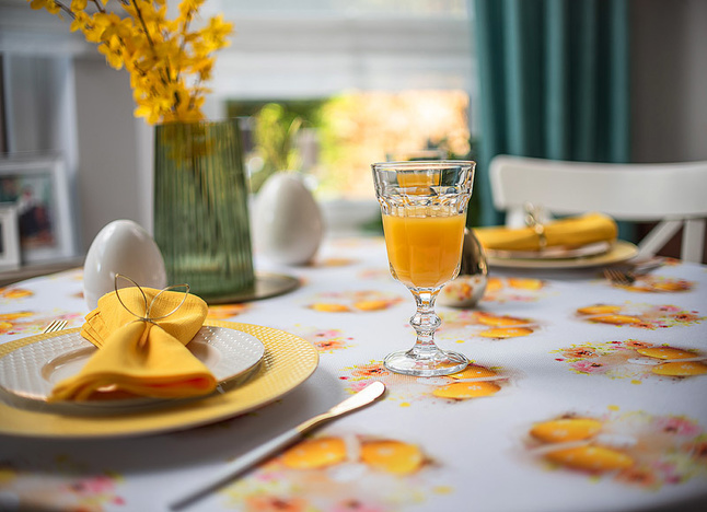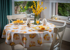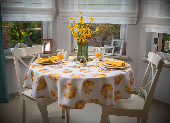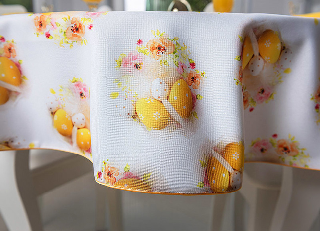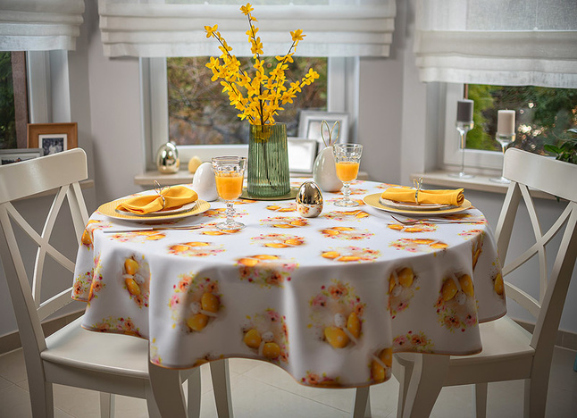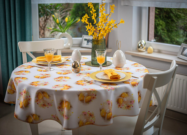 Ten obrus zachwyca świątecznym wzorem, który wprowadza do wnętrza radosną i wiosenną atmosferę. Dominującym motywem są subtelnie rozmieszczone kompozycje żółtych pisanek w towarzystwie pastelowych, kwiatowych akcentów. Ciepłe, złociste odcienie żółci harmonizują z delikatnymi różami i kremową bielą, tworząc na białym tle tkaniny efekt lekkości i świeżości. Motywy pisanek zostały precyzyjnie rozmieszczone na całej powierzchni obrusu, zapewniając estetyczny i symetryczny wygląd niezależnie od ustawienia zastawy stołowej. Każda powtarzalna pisankowa kompozycja stanowi motyw o średnicy około 14cm.
