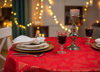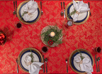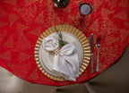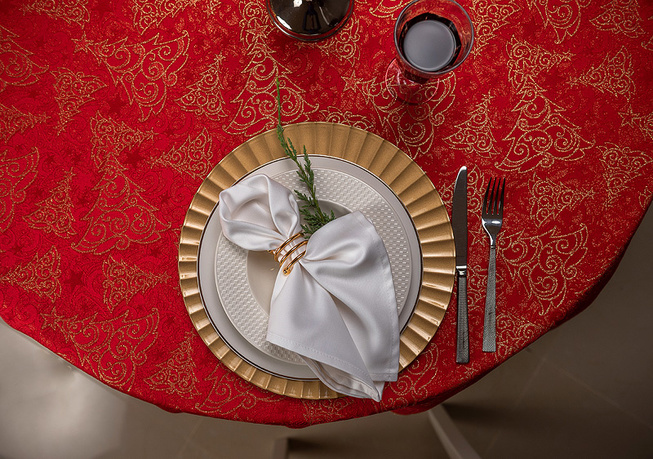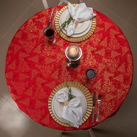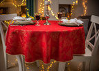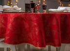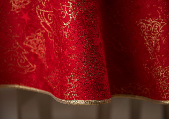 Obrus plamoodporny Christmas Tree RED to elegancka i pełna magii propozycja na świąteczny stół. Na czerwonym tle tkaniny ukazuje się bogaty, żakardowy wzór, w którym złote choinki, gwiazdy i spiralne ornamenty mienią się niczym świąteczne światełka. Dzięki trójwymiarowej strukturze tkaniny i zróżnicowanemu nasyceniu złotej barwy, obrus prezentuje niezwykłą głębię i zmienia swój charakter w zależności od kąta padania światła. To dekoracja, która zamienia każdy stół w centrum świątecznych opowieści – pełnych ciepła, elegancji i odrobiny tajemnicy.