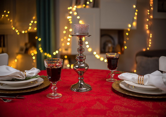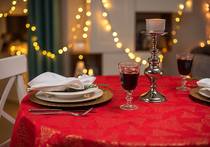 Plamoodporność: Obrus został wykonany z wysokiej jakości tkaniny plamoodpornej, co znacznie ułatwia utrzymanie go w czystości nawet podczas obfitych, świątecznych posiłków. Dzięki specjalnej apreturze rozlane płyny nie wnikają w głąb materiału, lecz tworzą krople na powierzchni, które można łatwo usunąć ściereczką.