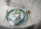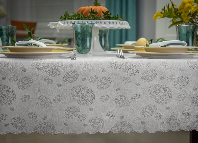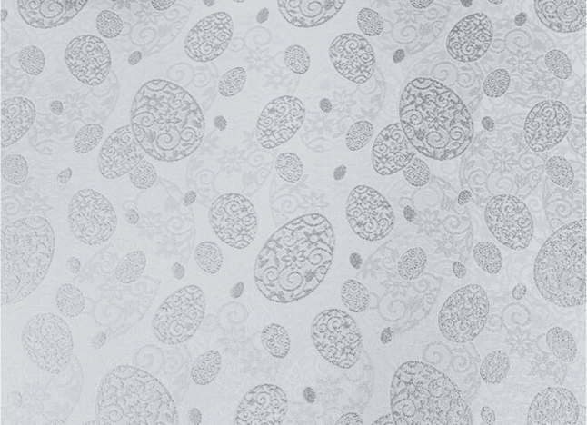 Przepiękny wielkanocny obrus w kolorze jasno-srebrnymz pewnością doda elegancji niejednemu świątecznemu spotkaniu przy stole.
