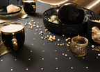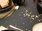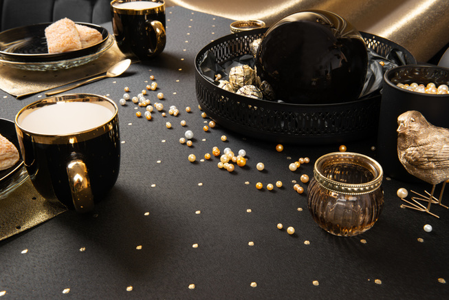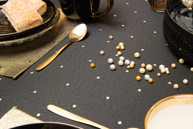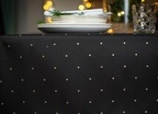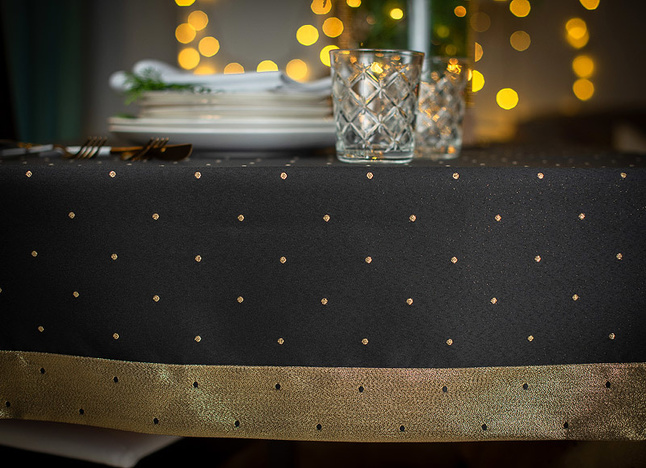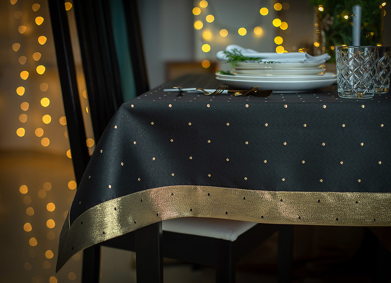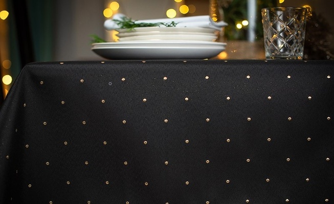 Obrus ma interesującą strukturę, a kropki o wymiarze 5 mm są rozmieszczone w odstępach co 5 cm na całości tkaniny. Obrus można położyć na lewej i prawej stronie, bo z każdej prezentuje się bardzo efektownie. Z prawej na czarnym tle ma małe złote kropki, a na lewej, na połyskującym złotym tle, czarne kropki. Dzięki temu stół może zawsze wyglądać inaczej ale równie pięknie.